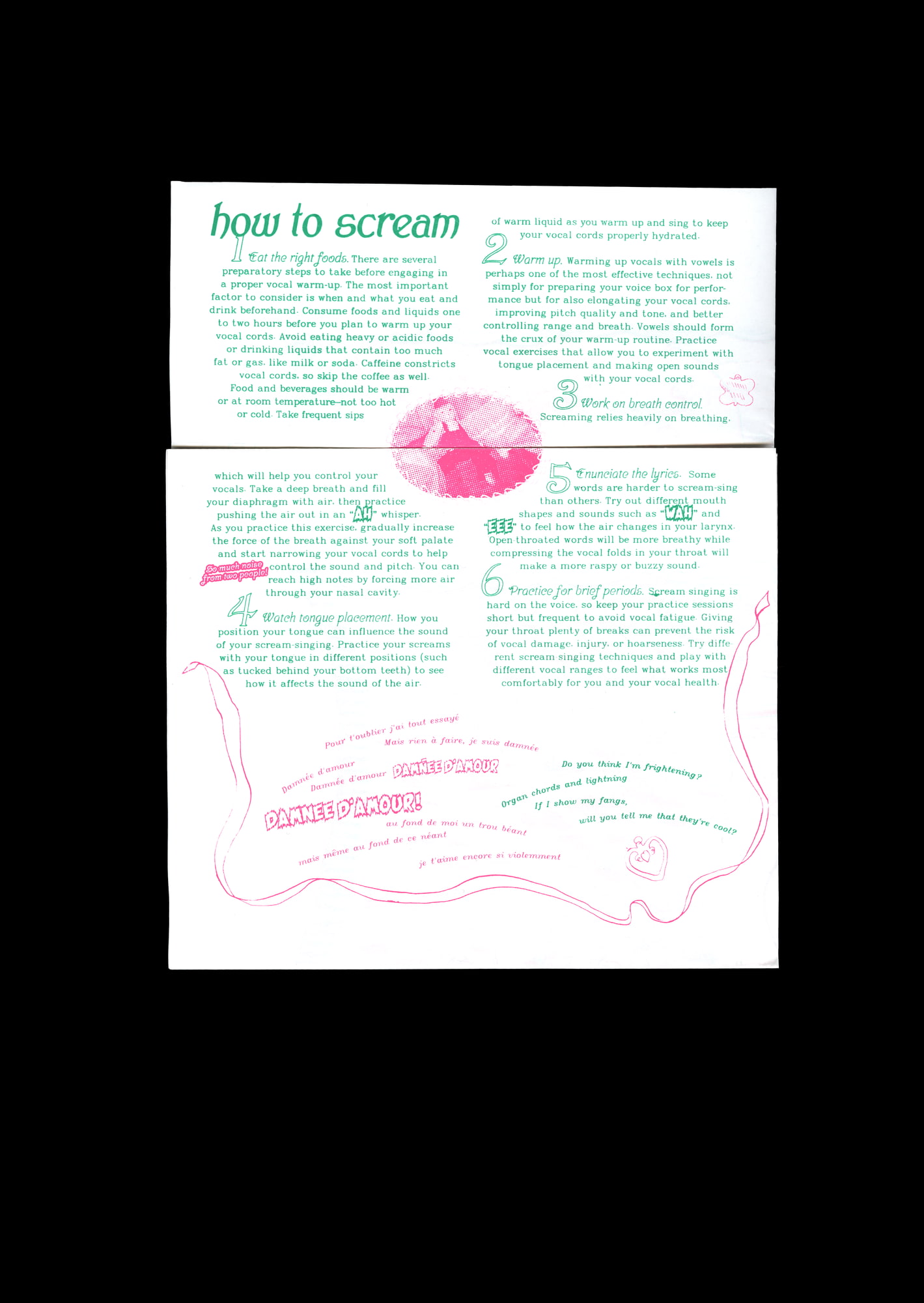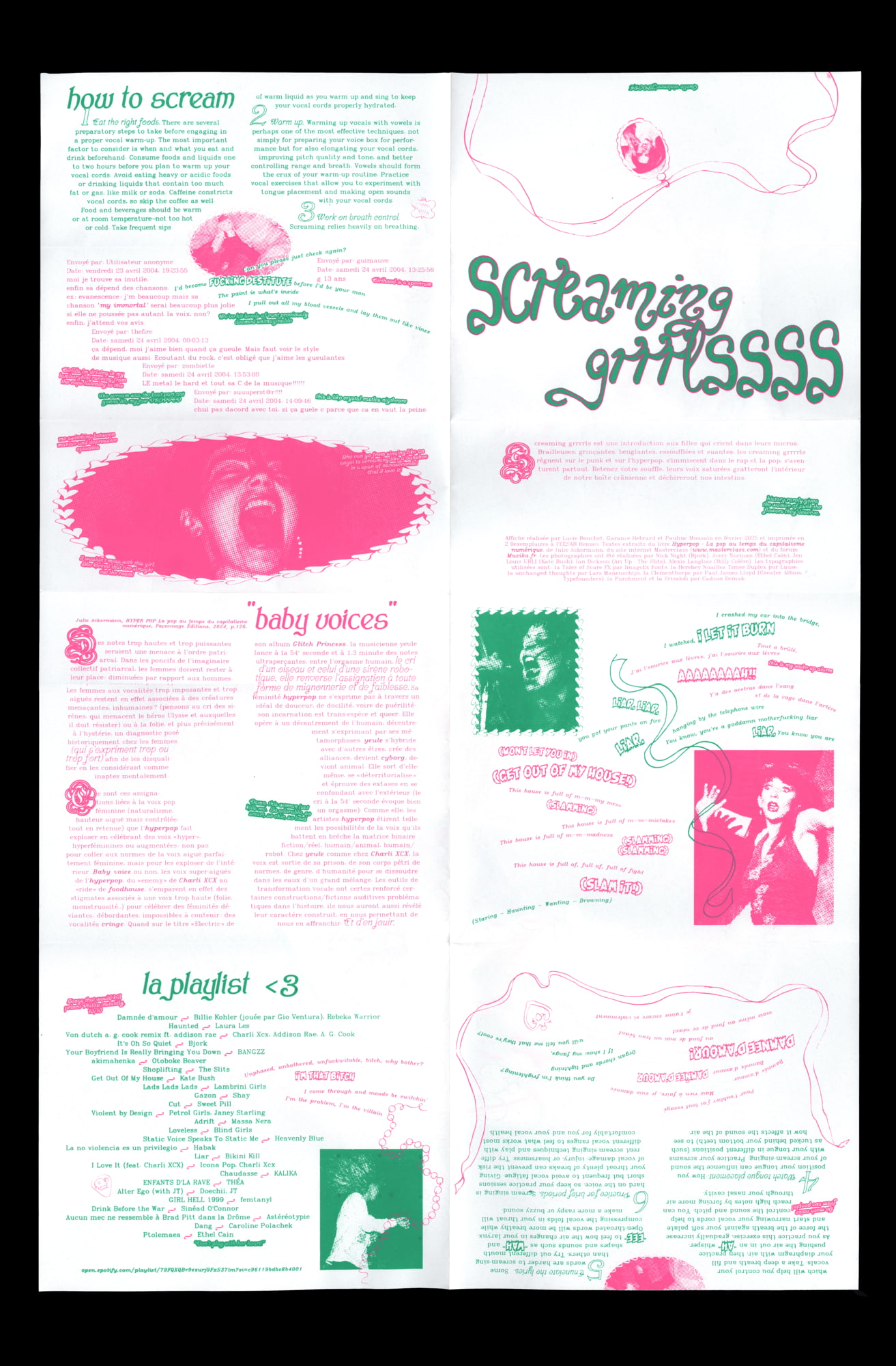 Screaming grrrlssss est un hommage aux filles qui crient dans leurs micros / une playlist / une édition se déployant en affiche. Brailleuses, grinçantes, beuglantes, essoufflées et suantes, les screaming grrrrls règnent